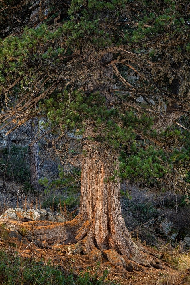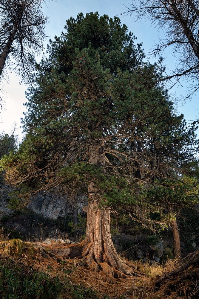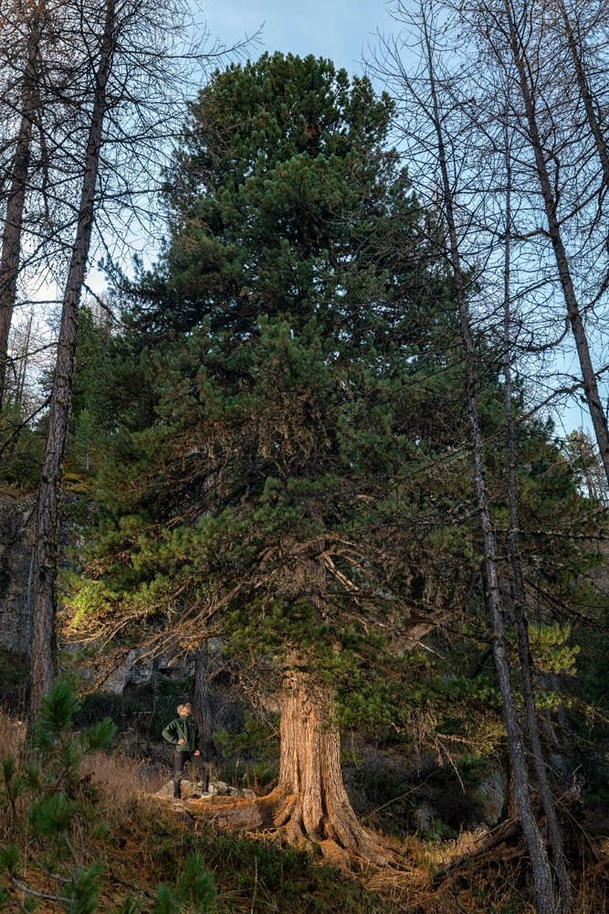 Surnommé l’arolle millénaire, ce pin cembro sert de point de repère aux habitants de Val d’Isère, été comme hiver. Sa couleur verte, persistant toute l’année, le différencie parfaitement des mélèzes voisins qui, après l’or flamboyant de l’automne, perdent leurs aiguilles et passent l’hiver dénudés. Mais c’est surtout sa taille imposante qui permet de le repérer à 2 170 mètres d’altitude, sur le replat d’un versant pentu entre deux barres rocheuses surplombant le hameau de Laisinant. C’est là qu’il pousse très lentement depuis au moins trois siècles, à la limite supérieure de la forêt d’altitude, dans ce que l’on nomme « la zone de combat », là où les contraintes climatiques finissent par empêcher la croissance des arbres et des arbustes. Il lui en faut donc de la détermination ! Sa silhouette équilibrée cache une fourche de deux troncs principaux qui témoignent du poids important de la neige en hiver. Celle-ci a en effet causé la rupture de son tronc d’origine. On trouve de nombreuses traces de passages d’animaux sous l’arbre, notamment le renard, le tétras lyre et le cassenoix moucheté. Le pin cembro entretient avec ce dernier un rapport privilégié, puisqu’il est le principal disséminateur