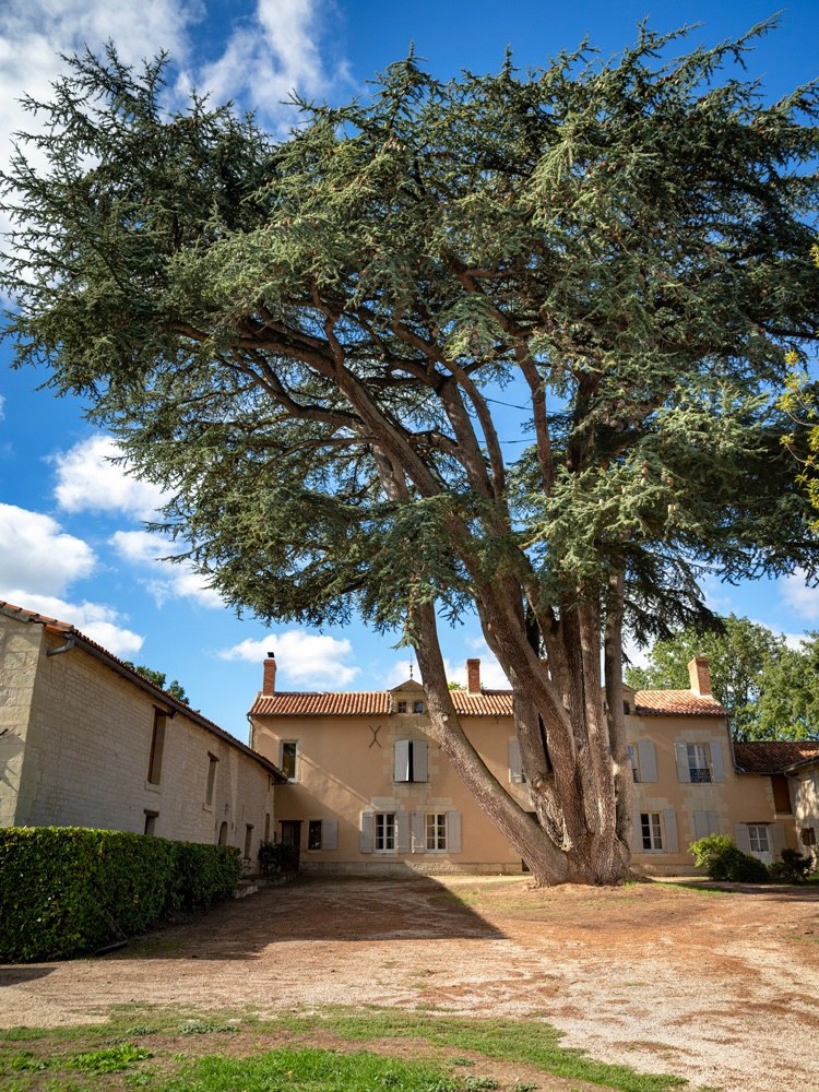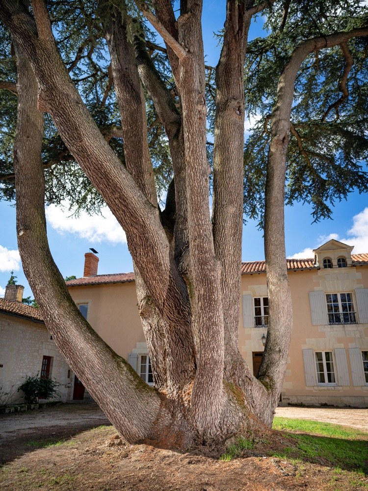 On le voit de loin quand on approche du domaine du Haut-Vernay, mais c’est véritablement à son pied que l’on découvre les dimensions extraordinaires de ce cèdre du Liban. Il est comme un bouquet d’arbres, une cépée de huit troncs qui montent vers le ciel, à près de 30 mètres, presque à vouloir chatouiller les nuages. Sa circonférence approche les 7 mètres à hauteur d’homme, mais tutoie les 10 mètres à la souche, au niveau du collet. « Il était bien plus grand avant », me confie Philippe Soulassol, le propriétaire. « Quand nous avons acheté la maison, qui n’était plus habitée depuis des années, le cèdre avait vraiment pris ses aises, il recouvrait pratiquement toutes les toitures et il a fallu évidemment le contenir, car il mettait en péril les bâtiments. C’est ainsi que trois grosses charpentières ont été coupées, il y a une trentaine d’années, et des haubans ont été posés à différents endroits, il y a dix ans. » Aujourd’hui, c’est un arbre très équilibré, il trône dans la cour en forme de U et son houppier est très aérien : il fait la joie et la fierté de ses propriétaires. Il a été classé « arbre remarquable » en 2018. Situé en pleine nature, entre bois et champs, le domaine accueille beaucoup d’oiseaux : des mésanges, des pigeons, des tourterelles… Tout ce petit monde ailé profite largement du cèdre, y compris la nuit, car on retrouve régulièrement au sol des pelotes de réjections et des fientes de la chouette effraie. Les fouines aussi s’en donnent à cœur joie, avec tous ces troncs et branches à grimper et dévaler.