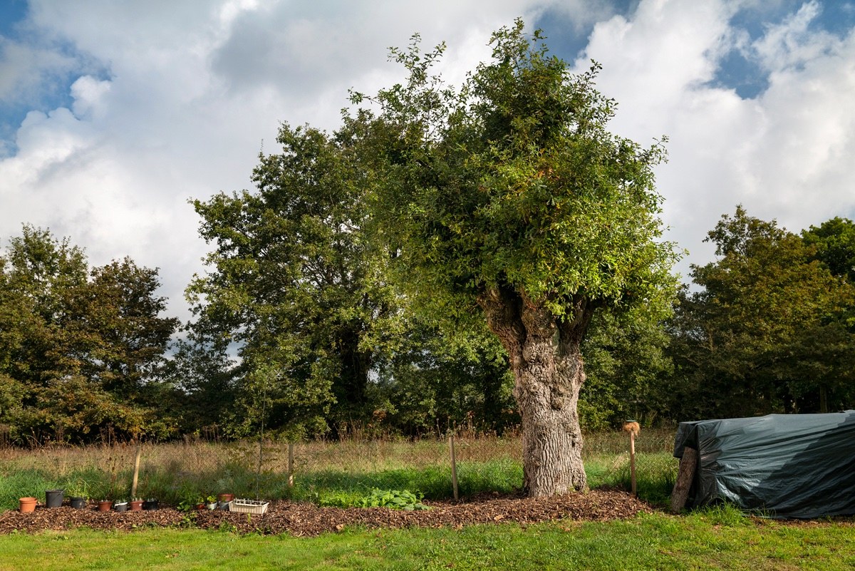 En cours de restructuration grâce à la Maison botanique de Boursay (Loir-et-Cher), ce chêne de Nort-sur-Erdre abrite de nombreux insectes et oiseaux. Il dévoile un aspect tortueux. Ses couleurs tournent grisâtres l’hiver et vertes du printemps à l’été. On lui connaît un petit frère, juste à côté, lui aussi en cours de restructuration pour reformer des arbres têtards, nommés aussi trognes. Les trognes sont le résultat de la coupe du tronc à une certaine hauteur pour provoquer le développement de rejets que l’on récolte ensuite à divers usages. Ils sont en régression en France du fait de l’évolution des pratiques agricoles. Ainsi, la mécanisation toujours plus importante conduit notamment au recalibrage des haies. Leur conservation n’en est donc que plus importante. Les propriétaires, qui viennent d’arriver sur le terrain, sont aux petits soins. Rendez-vous dans quelques dizaines d’années pour apprécier le résultat de leurs efforts…