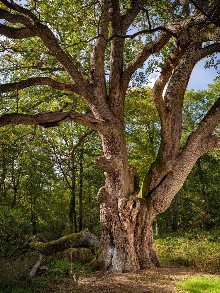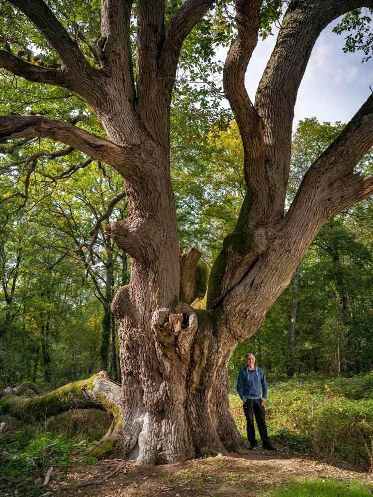Le gros chêne du bois du Thuilay est une curiosité locale, souvent le but d’une promenade en famille. C’est aussi le rendez-vous des chasseurs et peut-être même, à certaines heures, celui des amoureux. Au printemps, c’est le lieu où se rencontrent les cueilleurs de jonquilles, car nombreux sont ceux qui viennent ramasser la première fleur de l’année pour égayer leur maison de corolles jaune soleil. En plusieurs siècles, au moins cinq disent les spécialistes, peut-être même sept, il a été le témoin de bien des évènements. Parmi eux, il en est un, cuisant, qui aurait bien pu le faire disparaître. À la fin de la Grande Guerre, des prisonniers allemands étaient employés dans une ferme de Faverolles. Leur lieu de travail, à proximité de cet arbre, se trouvant trop éloigné de leur hébergement, leur déjeuner leur était remis le matin, à charge pour eux de le réchauffer. C’est ce qu’ils faisaient au pied du chêne. Un jour, par maladresse ou manque de prudence, le feu allumé trop près de l’arbre s’y propagea. Il fallut pour le sauver colmater la plaie avec du ciment. La vie d’un vieil arbre n’est pas un long fleuve tranquille : quelques semaines après son inscription au concours, l’une de ses charpentières se rompait subitement à la suite d’un gros coup de vent. Le jour de la prise de vue, Olivier Hanquez, qui a présenté la candidature, ne peut se rendre disponible comme prévu : il est à la maternité où sa femme a accouché plus tôt que la date pressentie. Rendez-vous manqué, comme si, pour une fois, l’arbre voulait esquiver un rendez-vous. La maman et le bébé vont bien, le vieil arbre avait finalement donné rendez-vous au papa là où il devait être, c’est-à-dire auprès des siens, en attendant, un jour, de rencontrer toute la famille à l’occasion d’une promenade en forêt.
