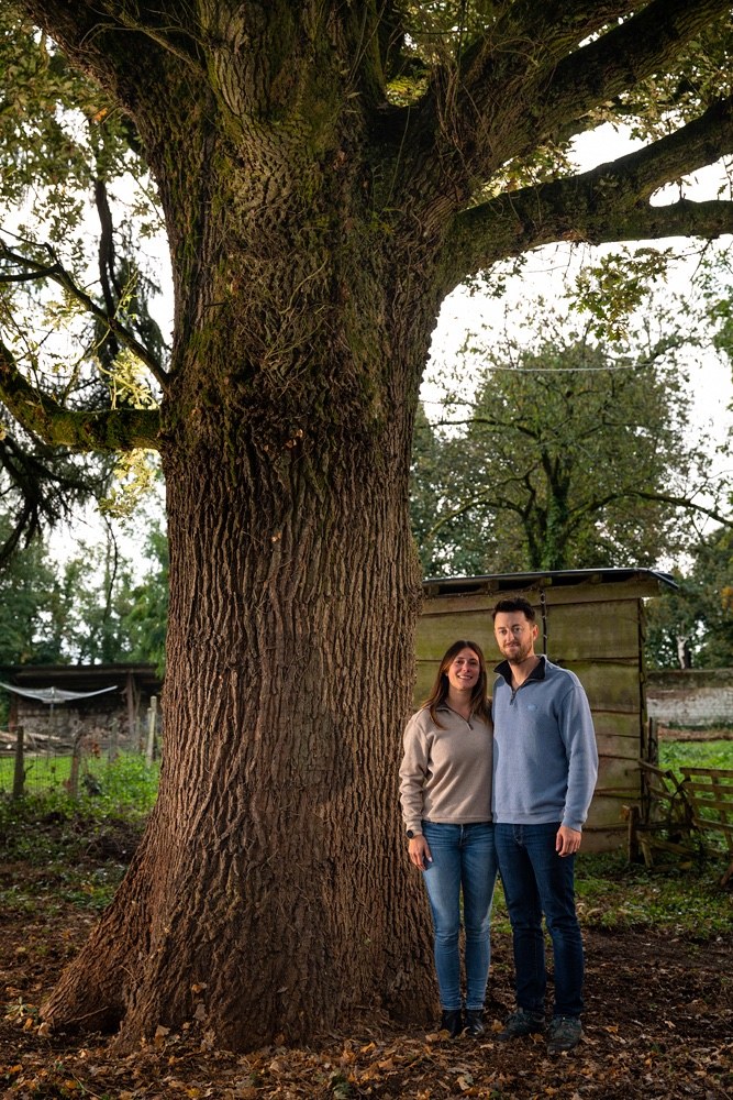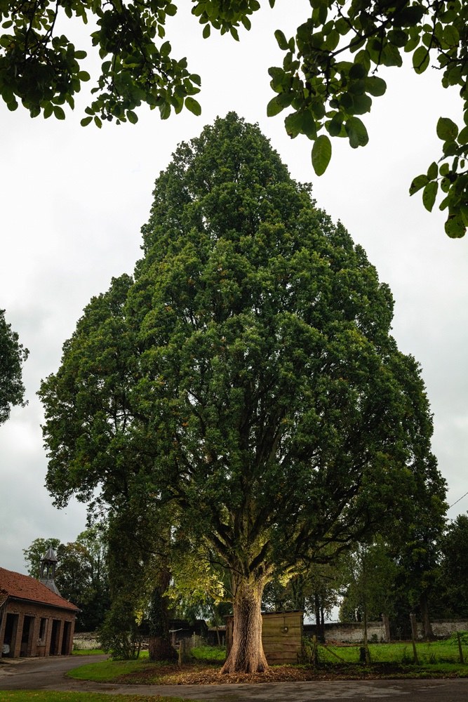 Ce chêne à la symétrie quasi parfaite et de forme pyramidale est à la fois une rareté et une fierté locale. Clément Lefebvre et son épouse, le jeune couple propriétaire, ont fort à faire avec l’entretien de ce domaine récemment acquis, mais ils ne manquent heureusement pas d’amour pour les arbres et la nature. Le soin avec lequel ils ont préparé le chêne pour que les prises de vues soient les plus réussies possibles en témoigne. Ils me renseignent sur le fait que le chêne n’a visiblement jamais été élagué et que ce n’est pas la taille qui explique donc cette forme très originale pour un représentant de son espèce. En plus de deux siècles d’existence, il a été témoin de trois guerres et de l’occupation des deux châteaux alentour. Il en aurait bien des histoires à raconter…