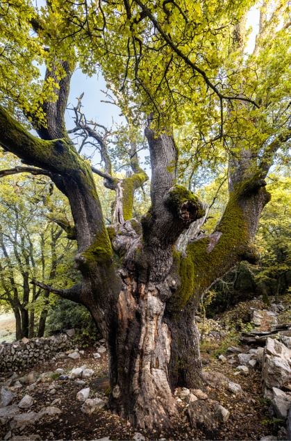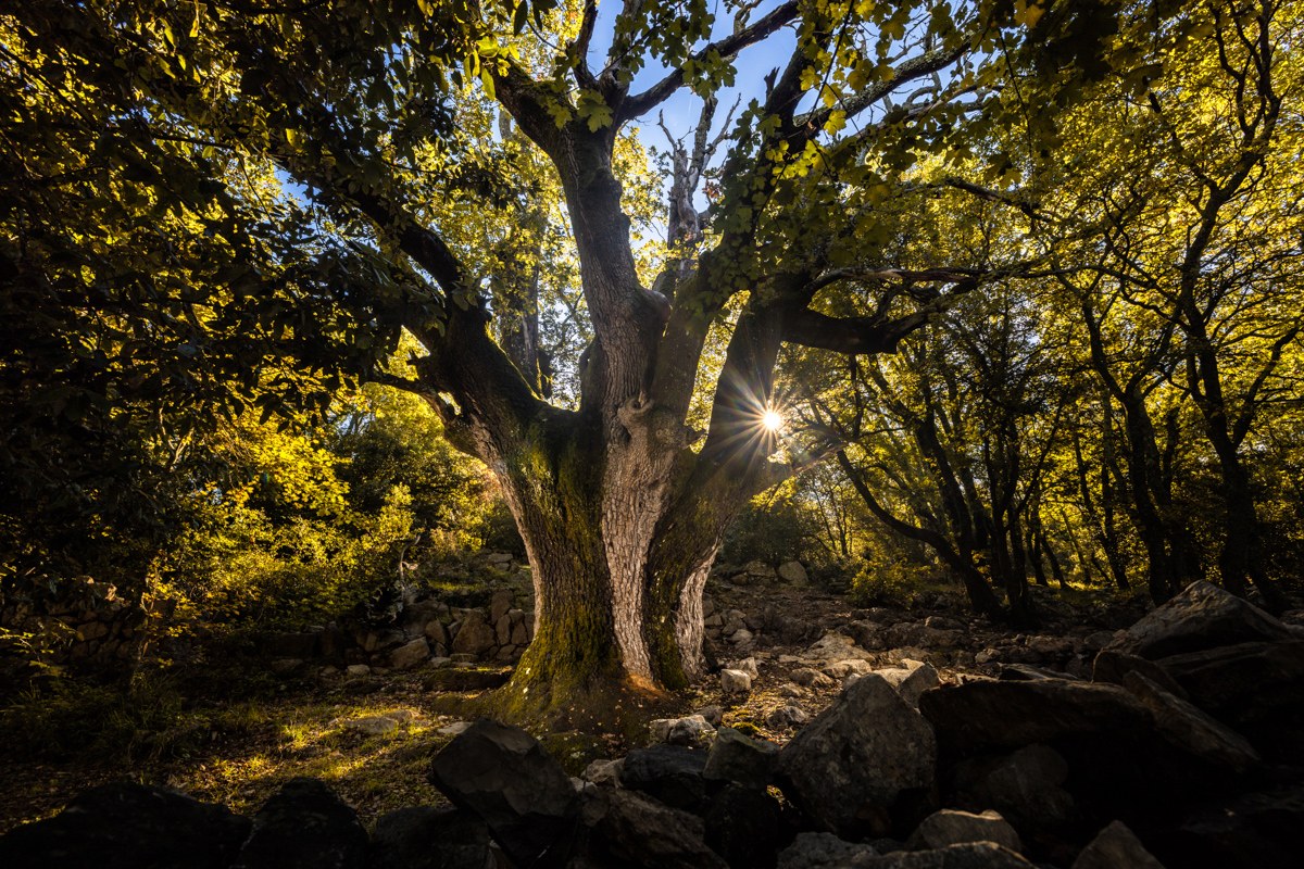 Pour admirer le gros chêne au sommet du baou (rocher en provençal) de la Gaude, à Saint-Jeannet, dans l’arrière-pays niçois, il faut être motivé et marcher une heure et demie depuis le centre historique. Entouré de quatre murs en pierres sèches, tout porte à croire qu’il a grandi au milieu d’une bergerie en ruines. Un autre élément attire l’attention sur cet arbre unique : de nombreux tas de pierres ou clapiers. Ceux-ci sont les témoins d’une technique extrêmement efficace permettant de créer par condensation une zone d’humidité favorable à la croissance de l’herbe. On raconte qu’il s’agissait d’un chêne sacré près duquel des cérémonies druidiques auraient eu lieu. On remarque encore aujourd’hui qu’une petite pierre polie a été positionnée à l’est de l’arbre. Pierre à sel, pierre d’autel ou pierre sacrificielle ? Un chêne sacré peut-être, mais pas uniquement d’un point de vue mystique, car il l’était aussi pour les troupeaux de moutons et de chèvres. En effet, il fut un temps où les terrasses alentour étaient cultivées et les troupeaux menés ici en pâturage. À l’ère révolue du pastoralisme à Saint-Jeannet, dont le saint patron est un berger, un seul arbre à la ronde procurait une ombre généreuse et de la fraîcheur, c’était lui, le fameux gros chêne. Aujourd’hui, ce sont les randonneurs qui se délectent de ses bienfaits. L’arbre a longtemps appartenu à des particuliers et c’est très récemment qu’il a été offert à la commune sous la forme d’un don. Le notaire étant sur le point de finaliser la succession, il est envisagé la mise en place d’une signalétique patrimoniale, qui parlera bien entendu de son histoire, liée à son implantation géographique et géobiologique, et appuie l’idée que ce chêne a pu être par le passé un arbre sacré. Mais pitié, pas de panneaux à proximité immédiate, et encore moins sur l’arbre lui-même !