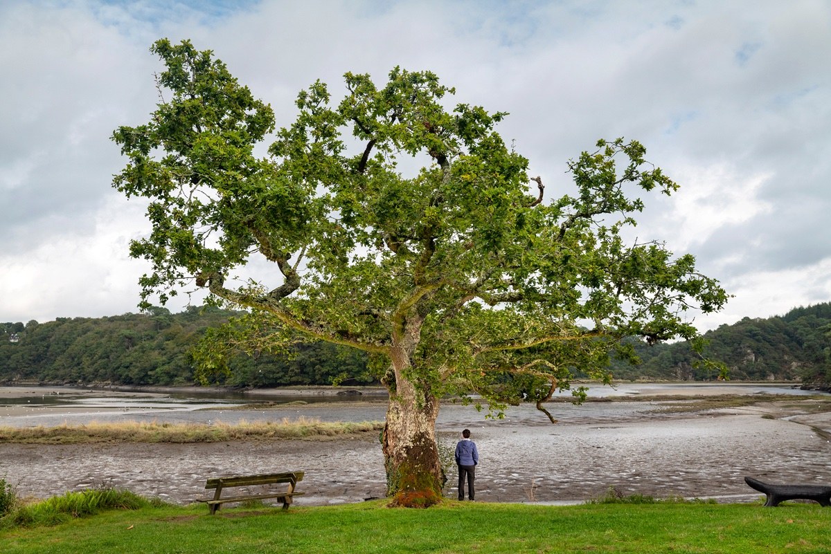 Ce chêne installé en bordure de l’estuaire de la Laïta, à l’entrée du site de Saint-Maurice, une ancienne abbaye cistercienne, invite à l’introspection. Il faut dire qu’à Clohars-Carnoët, il a judicieusement choisi sa place. Avec son tronc massif et sa couronne étalée et tortueuse, il a été le témoin des années sur ce lieu historique, propriété du Conservatoire du littoral depuis 1991. Mais il est aussi et surtout le gardien d’un paysage qui ne laisse personne indifférent, au pied de la rivière qui serpente dans la vallée boisée