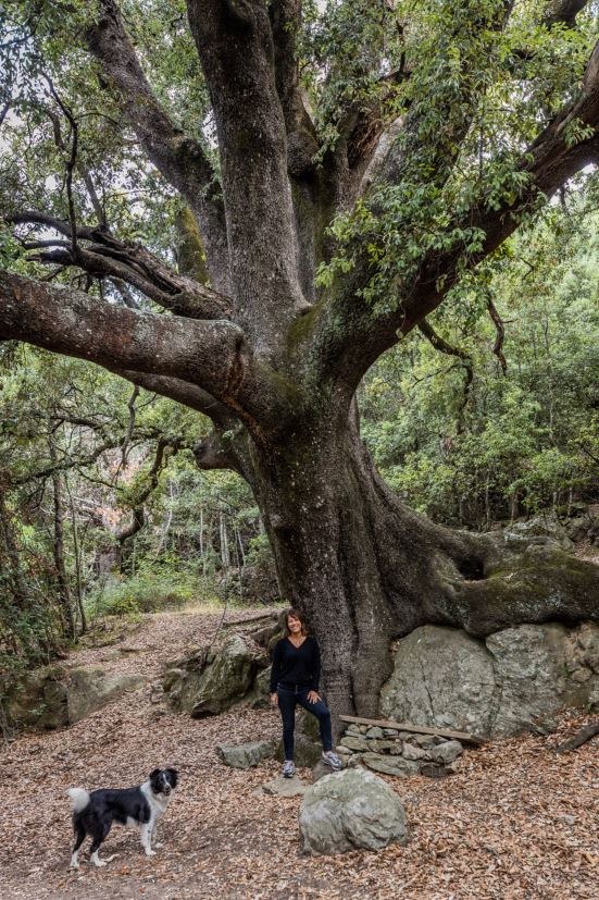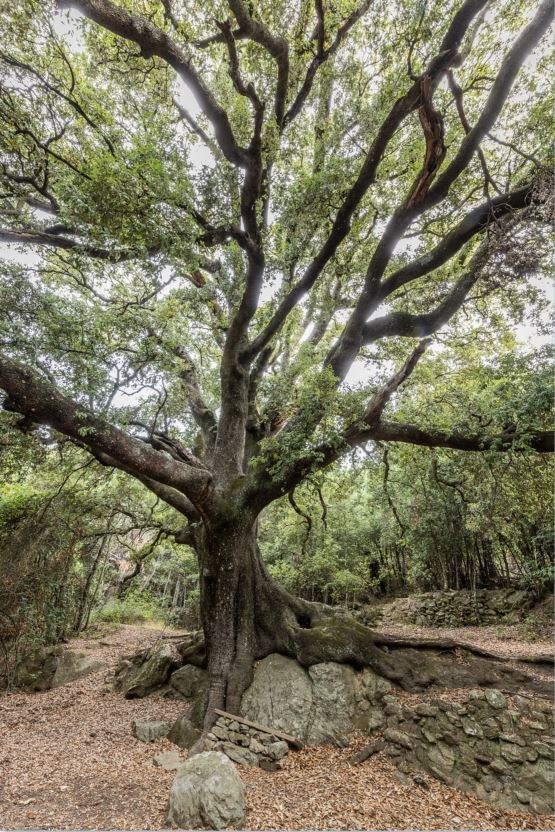 Ce grand chêne, que l’on appelle ici « u liccionu » en langue corse, est situé sur la commune de Saliceto, dans une région montagneuse de la Haute-Corse, non loin de Corte. Plusieurs fois centenaire, il est implanté à côté d’un petit sentier de montagne, entre deux hameaux. On ne le découvre vraiment qu’une fois arrivé tout près, au milieu de nombreux autres chênes qui ont poussé autour de lui sur de petites terrasses de pierres sèches autrefois cultivées. La cueillette de glands pour les cochons et les ânes était encore fréquente au début du siècle dernier. Il est majestueux, s’élève haut vers le ciel et ses racines gigantesques ont poussé en encerclant un gros rocher. Ses branches s’étalent horizontalement sur plusieurs mètres, créant une atmosphère particulière de sérénité et de bien-être. Les enfants viennent y jouer et grimper, c’est un lieu où les familles se retrouvent pour passer un moment agréable. Installée depuis quelques mois dans le village tout proche pour développer une activité d’herboriste et de naturopathe, Isabelle Teroitin, qui a proposé la candidature, se rend régulièrement au pied du chêne pour méditer et pratiquer le yoga. Quel plus bel endroit peut-on trouver pour se ressourcer et profiter des bienfaits d’un arbre séculaire ?