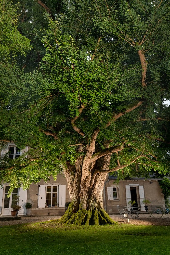 que dans le parc du domaine Saint-Hilaire, à Meung-sur-Loire, ce ginkgo a fière allure : avec un tronc puissant de 5,1 mètres de circonférence, ce trésor ornemental originaire de Chine vous ensorcelle de tous ses charmes. C’est sans aucun doute l’un des plus beaux spécimens de la région Centre-Val de Loire, et même au-delà. Vraisemblablement planté à la construction de la maison, il doit être âgé d’environ 170 ans. Rappelons que le ginkgo est l’unique survivant d’une famille d’arbres apparue à l’ère primaire et qui a connu son apogée au jurassique. Il s’agirait de la plus ancienne espèce d’arbre connue, qui n’a pratiquement pas évolué depuis des millions d’années. Sa culture est séculaire en Chine, dans les monastères, d’où il a été importé vers le Japon et la Corée, autour du XIIe siècle, avant d’être introduit bien plus tard en Europe, au XVIIIe siècle. -