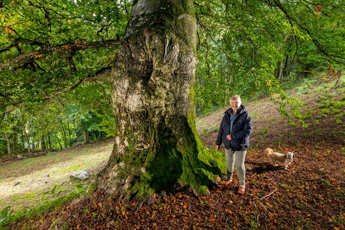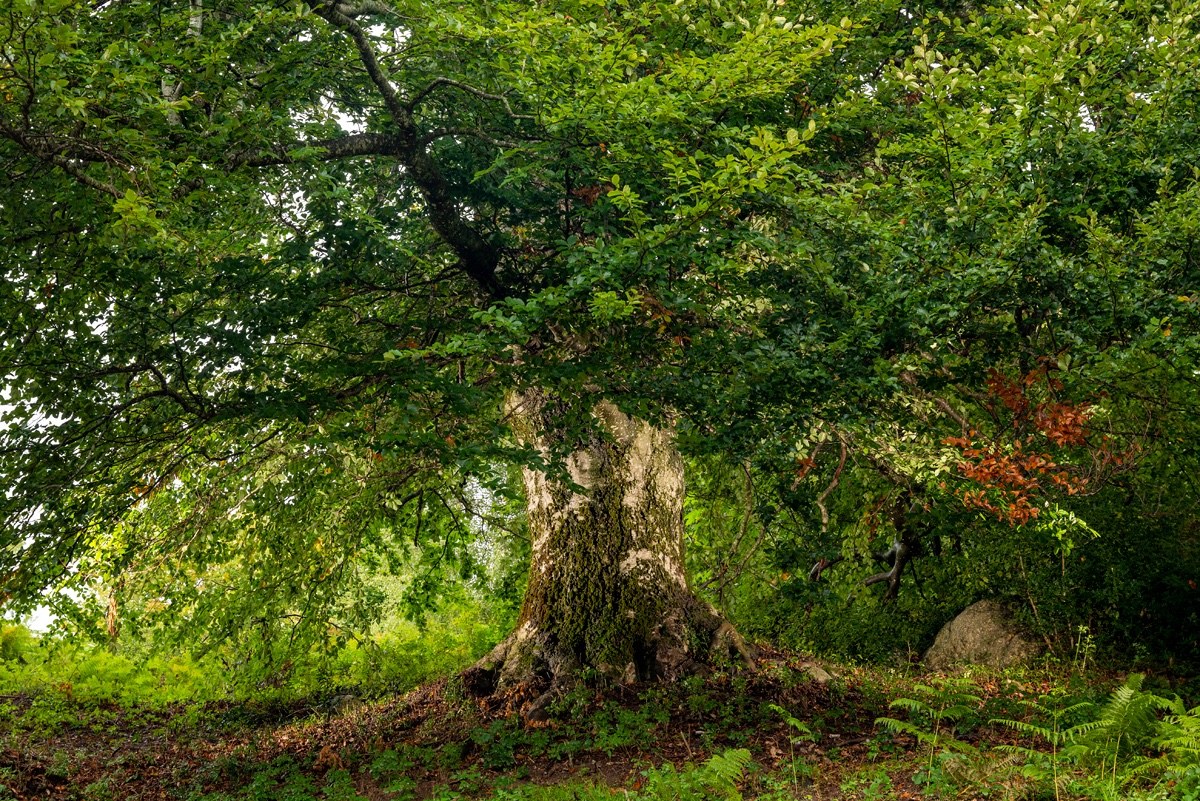 Avec son fût trapu de 5 mètres de circonférence qui s’élève vers la lumière d’un vaste ciel, en haut d’une colline perchée à 50 mètres d’altitude, ce hêtre commun est sans doute âgé de plus de 350 ans et ses branches puissantes laissent deviner une lutte incessante face au grand vent du Midi et aux lourdes neiges, jadis si nombreuses. On lit sur son tronc les traces laissées par ce combat sans merci contre les intempéries