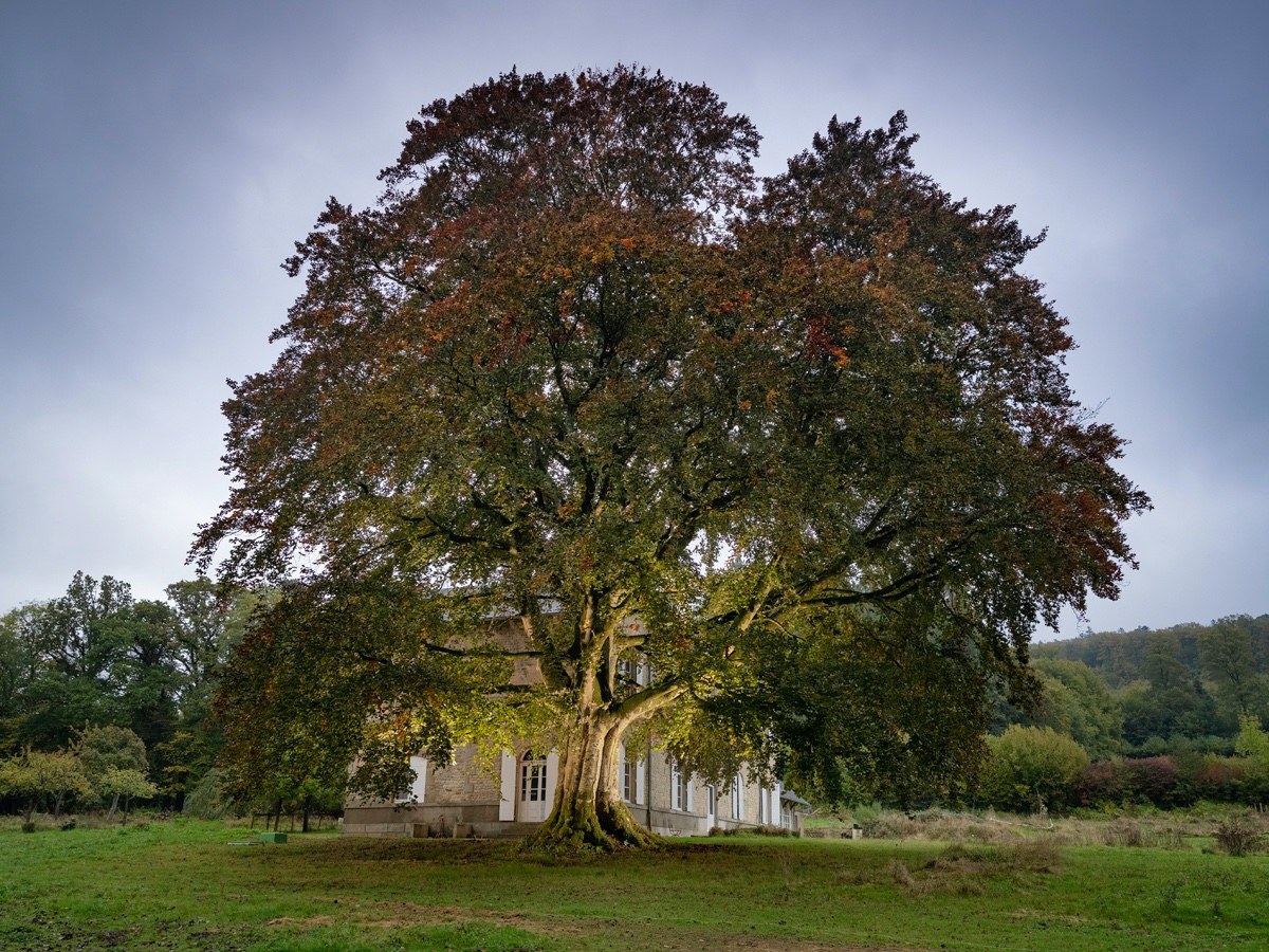 En lisière de la grande forêt d’Écouves, la plus vaste de Normandie avec 15 000 hectares, le château de l’Ermitage, construit en 1846, abrite dans son parc un arbre remarquable, un hêtre pourpre, près de deux fois centenaire. Arbre d’ornement par excellence, il a sans doute été planté par l’un des premiers propriétaires. L’un d’eux, le peintre Georges Lacombe (1868-1916), élève et ami de Paul Gauguin, s’installe au château en 1897. Il aménage un atelier et invite peintres et artistes en vue, notamment des membres du mouvement Nabi, jeunes peintres symbolistes passionnés d’ésotérisme et de spiritualité, disciples de Gauguin. Il faut dire que la situation du château est parfaite, à mi-chemin entre Paris et Pont-Aven. Le hêtre pourpre est un modèle idéal et il se retrouve vite en bonne place sur de nombreuses toiles. Après plusieurs décennies d’abandon, les propriétaires actuelles, Annabel Moreau et sa fille Zoé, souhaitent restituer la dimension artistique et culturelle des lieux, aidées par Nicolas Blanchard, qui conduit un travail de thèse pluridisciplinaire retraçant la fabuleuse épopée de la forêt d’Écouves, qu’elle soit historique, culturelle ou encore naturelle. Le hêtre pourpre de l’Ermitage est entre de bonnes mains.