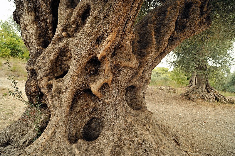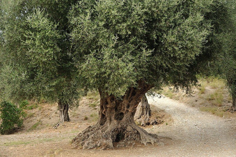 Aspect traditionnel de l’olivier, couleur marron-noir pour le tronc et feuillage vert-bleu.