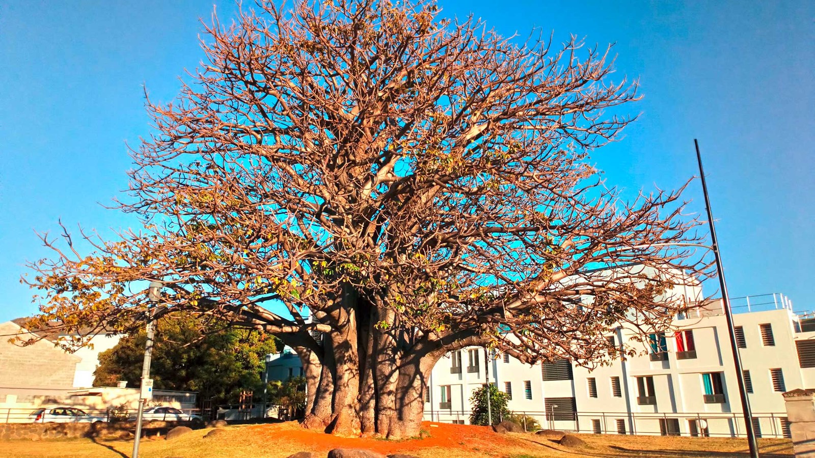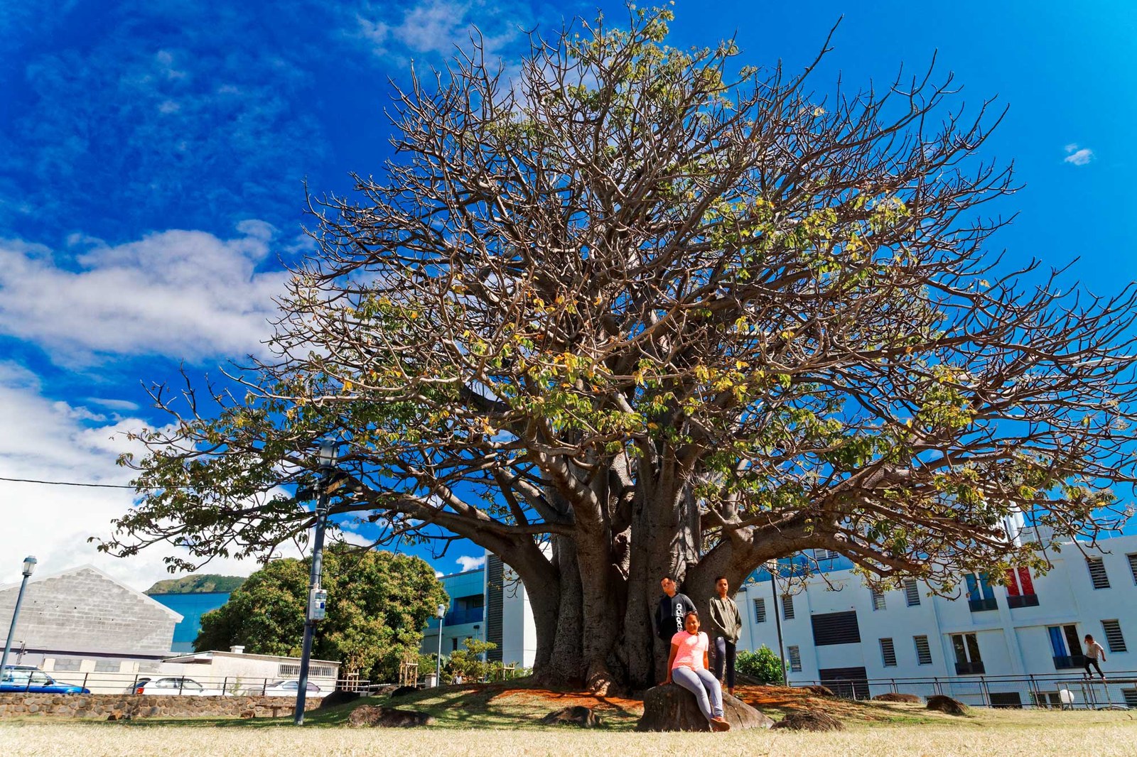 S’agit-il d’un ou de deux arbres accolés ? Il est difficile de répondre... Situé au milieu du quartier des Camélias, à Saint-Denis, ce baobab africain pousse librement, sur un petit promontoire enherbé. Son tronc gris ressemble à un gigantesque pied d’éléphant et il accueille volontiers les oiseaux des villes qui viennent se poser sur ses branches : martins, cardinaux, tourterelles malgaches... Il s’agit très certainement du plus gros baobab de La Réunion. Les baobabs africains auraient été introduits à La Réunion en 1767, soit environ un siècle après les premières installations humaines pérennes sur l’île. Les usages des fruits et des feuilles sont multiples, mais malheureusement peu connus à La Réunion. Les habitants du quartier sont très attachés à cet arbre. Ils pensent qu’il s’agit de l’un des vestiges de l’ancien domaine du château Morange, édifice remarquable de l’île, et que sa présence parle, quelque part, de l’histoire humaine et urbaine dionysienne.