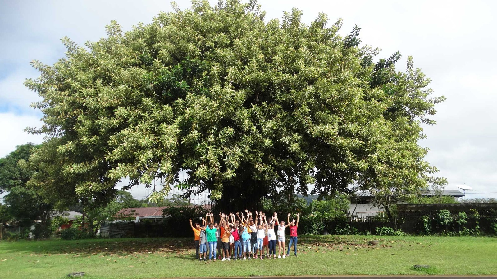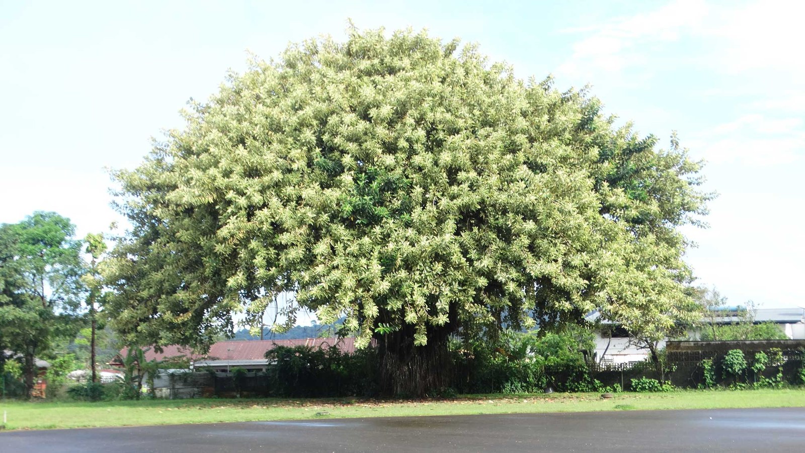 L’arbre caoutchouc fait partie du groupe des banians, ces arbres à croissance rapide qui peuvent atteindre des dimensions très importantes (plusieurs hectares), originaires d’Asie, mais qui ont été largement introduits dans la plupart des régions tropicales du monde, comme c’est le cas en Guyane. Toutes les parties de l’arbre produisent un latex blanc laiteux. Ce latex a été utilisé pour fabriquer du caoutchouc. Mais sa faible qualité, inférieure au caoutchouc produit par le latex de l’hévéa, n’a pas permis une véritable exploitation économique. Cet arbre se situe dans la cour de l’école Guimanmin à Matoury, en Guyane. De l’aveu même des élèves, il apporte beaucoup d’ombre dans une partie de la cour, une ombre toujours bienvenue, et son caractère majestueux donne un cachet supplémentaire à leur« jolie école ». Il aurait été planté dans la cour par un enfant, justement, il y a environ vingt-cinq ans. Les élèves peuvent être fiers du résultat.