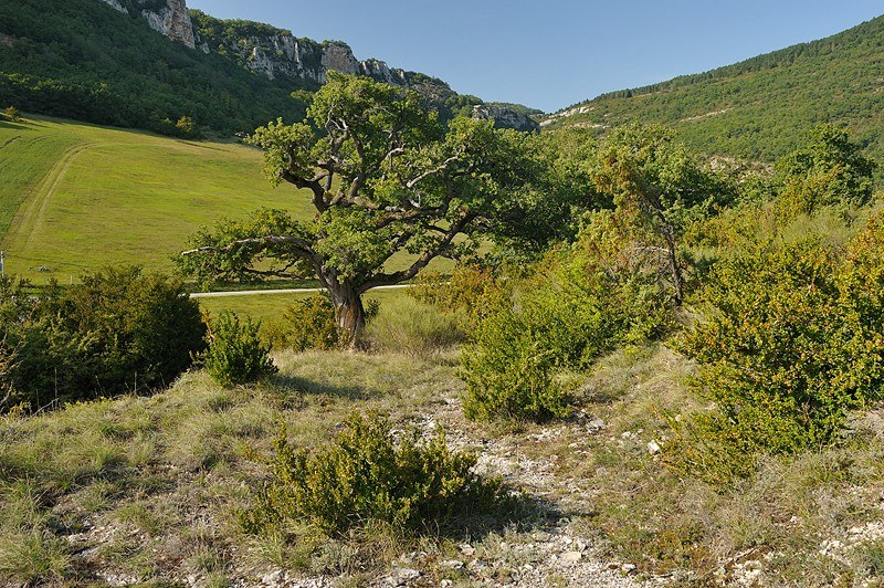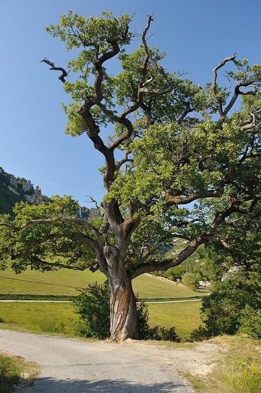 En toile de fond : le Vercors et ses larges vallées panachées de vert. Les formes tourmentées de ce chêne remarquable bordent une petite route qui monte vers un col. Son âge ? Plusieurs