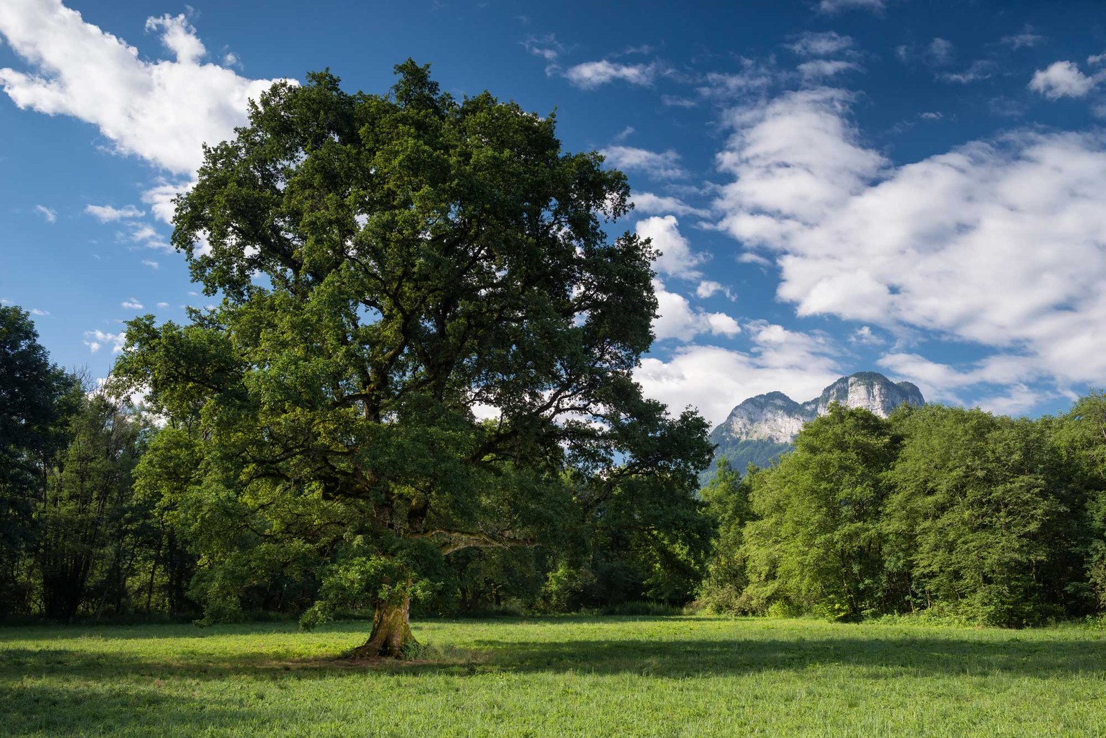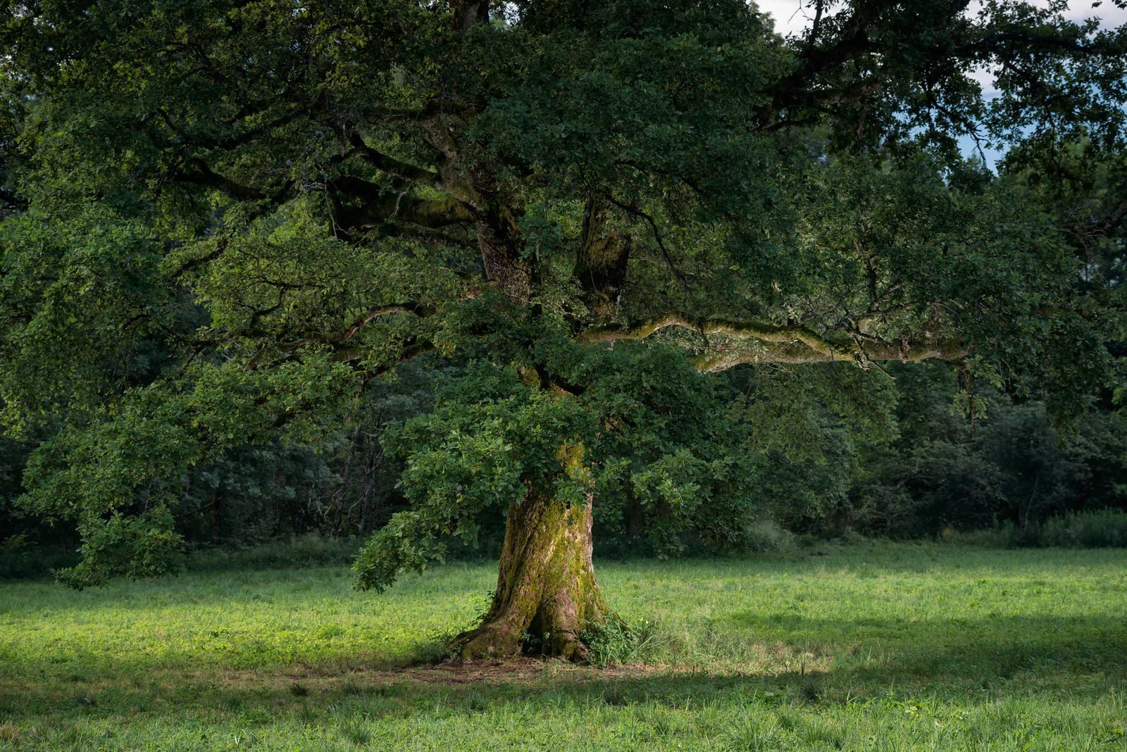 C’est un grand chêne au port harmonieux, avec un tronc large et robuste et un houppier