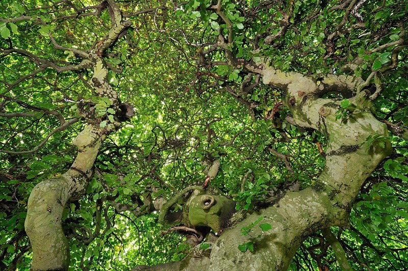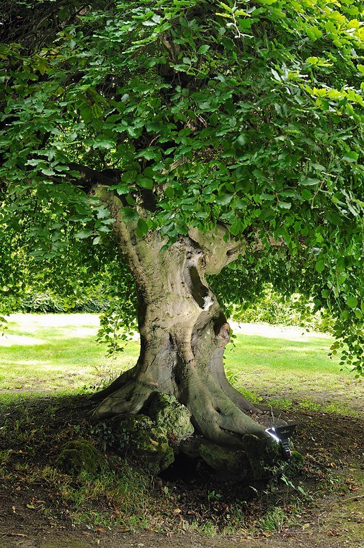 cachant en partie son large tronc torsadé et ses branches tordues. D’où son autre nom de hêtre tortillard. Il fut planté voici 300 ans sur les terres d’un ancien monastère, et son histoire