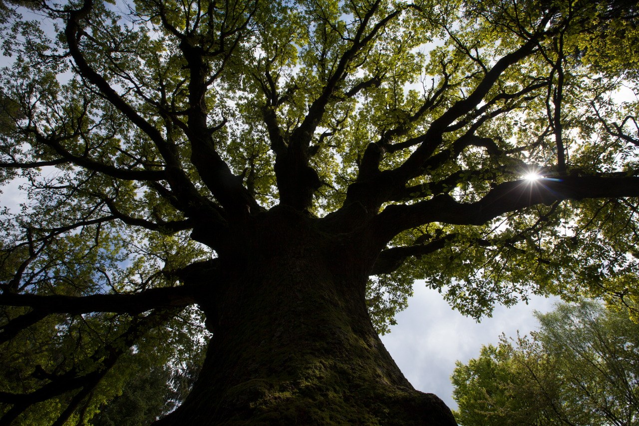 Superbe chêne bien déployé, tronc large, houppier aérien.