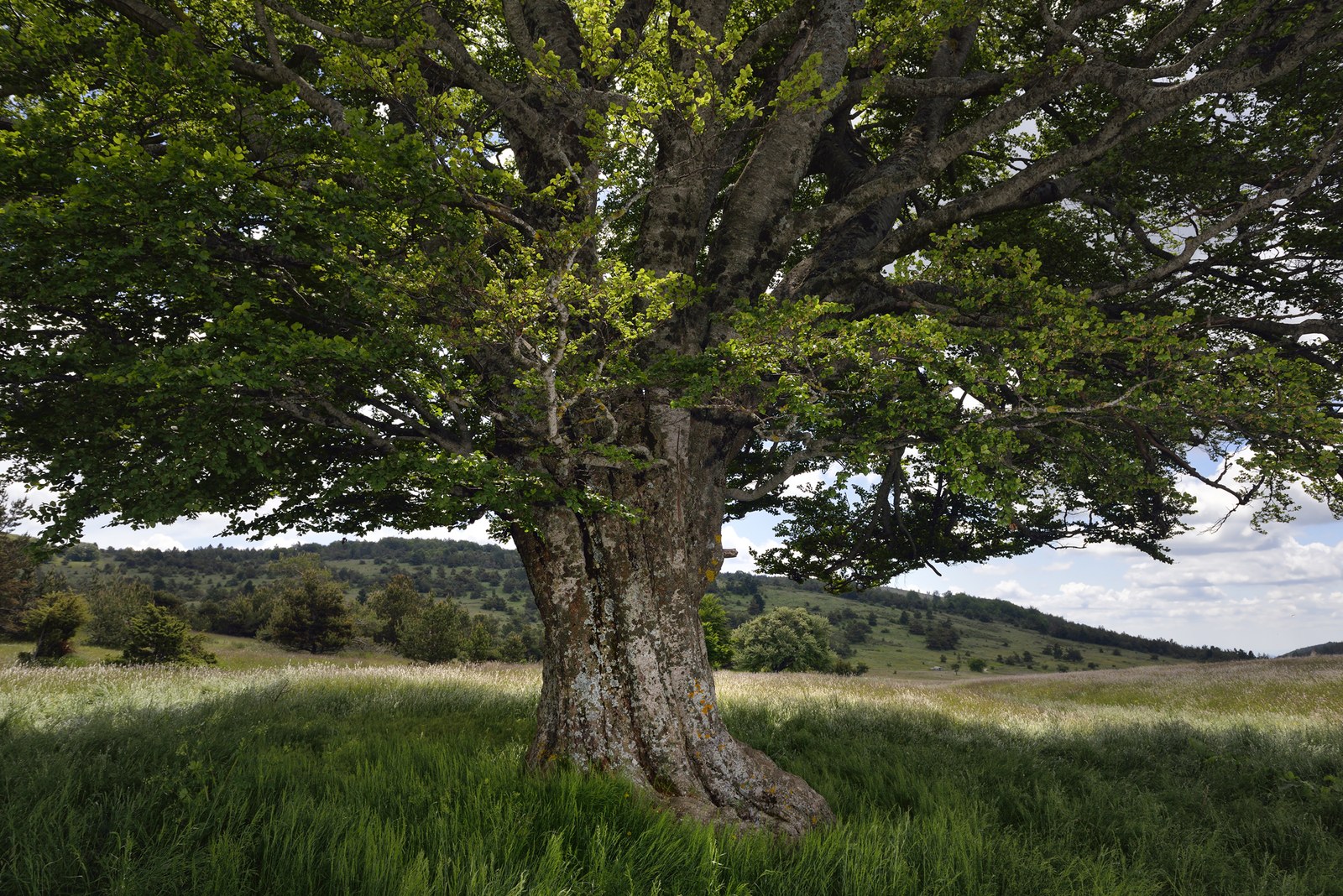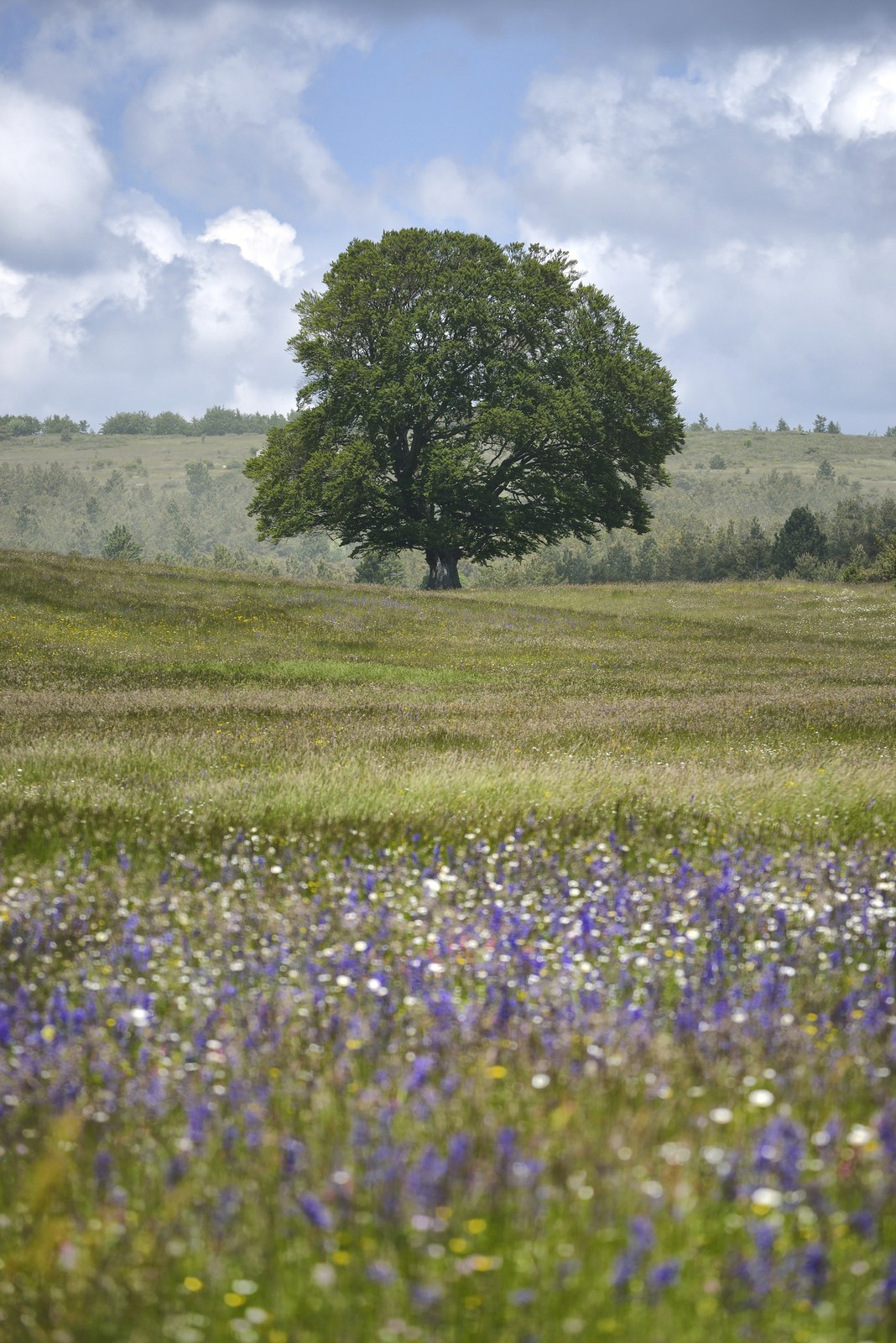 d’un ciel bleu moutonné de nuages. Le hêtre du Contadour fait face à