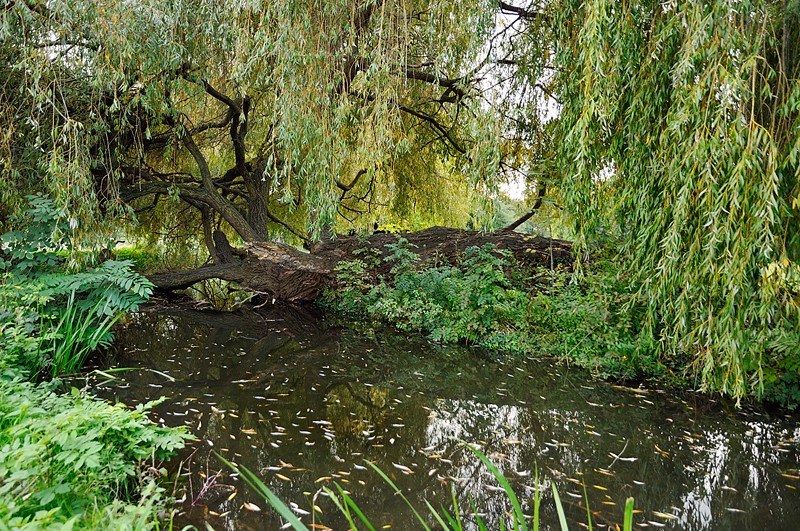 les racines d’un deuxième saule, il est reparti en hauteur, les deux saules ne formant plus qu’un. Le lieu a des airs de bayou, avec les écrevisses de Louisiane venues coloniser