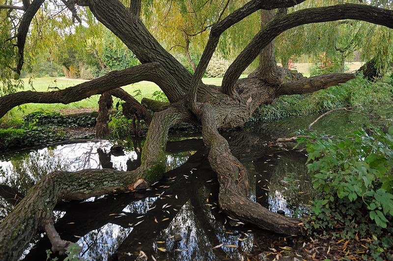 les étangs. Les branches du géant couché serpentent, à terre et dans l’eau, tels des anacondas. Ou bien s’épanouissent en pattes de mygale prête à broyer sa proie.