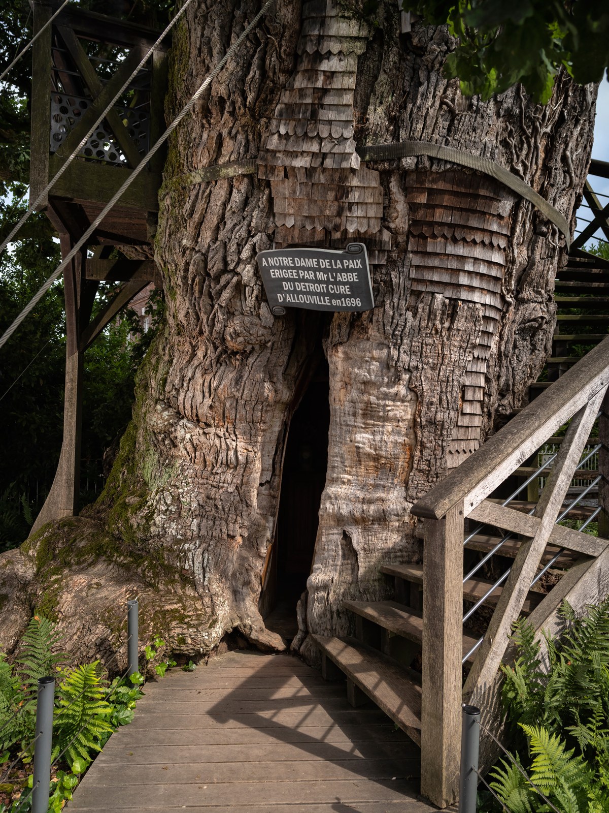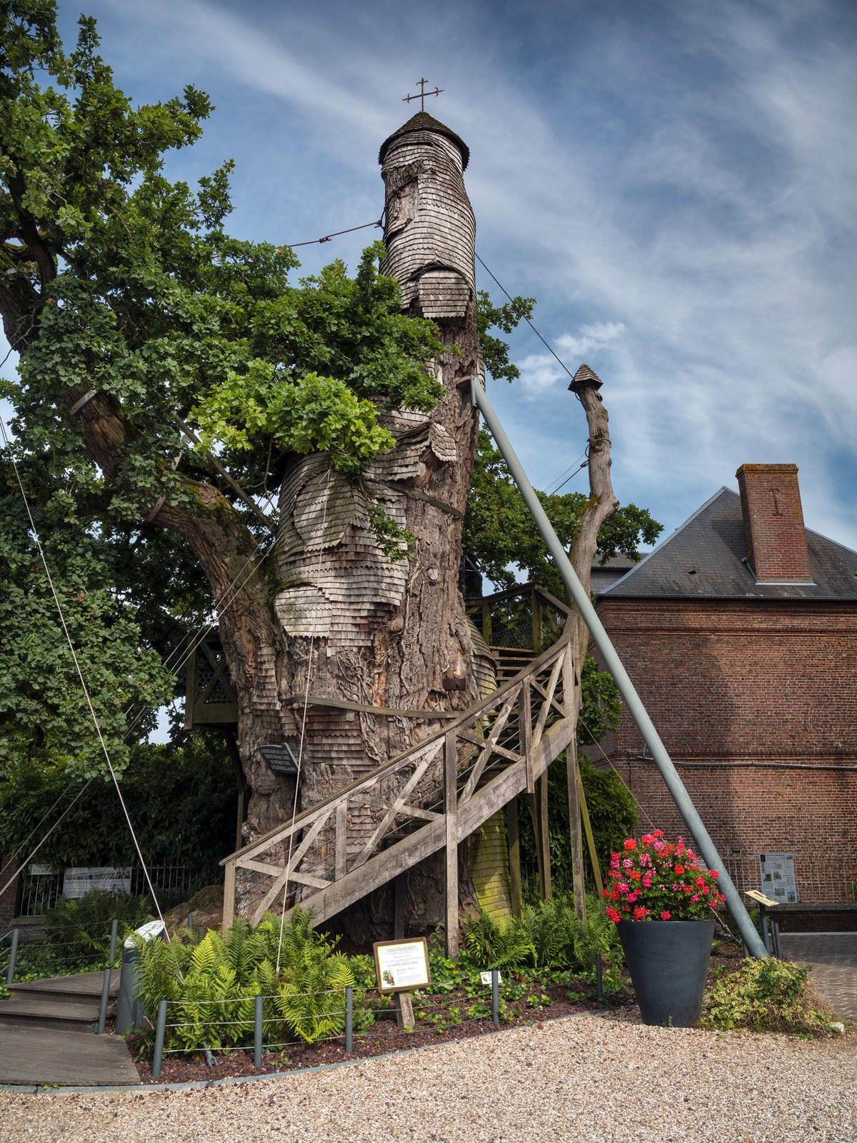 C’est l’un des doyens de notre pays. La légende voudrait qu’il ait été planté en 911, date de la fondation du duché de Normandie, mais les scientifiques pensent qu’il pourrait être plus âgé encore d’au moins un siècle. Il est donc au bas mot millénaire ! Deux petites chapelles superposées y ont été aménagées, la plus ancienne date de 1696. Il en a connu des vicissitudes ! Forcément, quand on traverse les siècles, on est exposé aux fureurs de la météo et à celle des hommes : plusieurs fois foudroyé, plusieurs fois menacé d’être coupé… Mais il est toujours là. Les habitants, des érudits, des amoureux des arbres, des personnalités… beaucoup lui ont consacré du temps et de l’amour. Il est aujourd’hui, consolidé par une structure métallique. Avec ses chapelles, son escalier en colimaçon, ses diverses pancartes, ses câbles et ses protections variées, il présente une silhouette étrange, mi-arbre, mi-robot. On préserve ce très vieil arbre, mémoire du temps qui passe, pour sa valeur culturelle et historique. Et ses 30 000 visiteurs annuels ne s’y trompent pas.