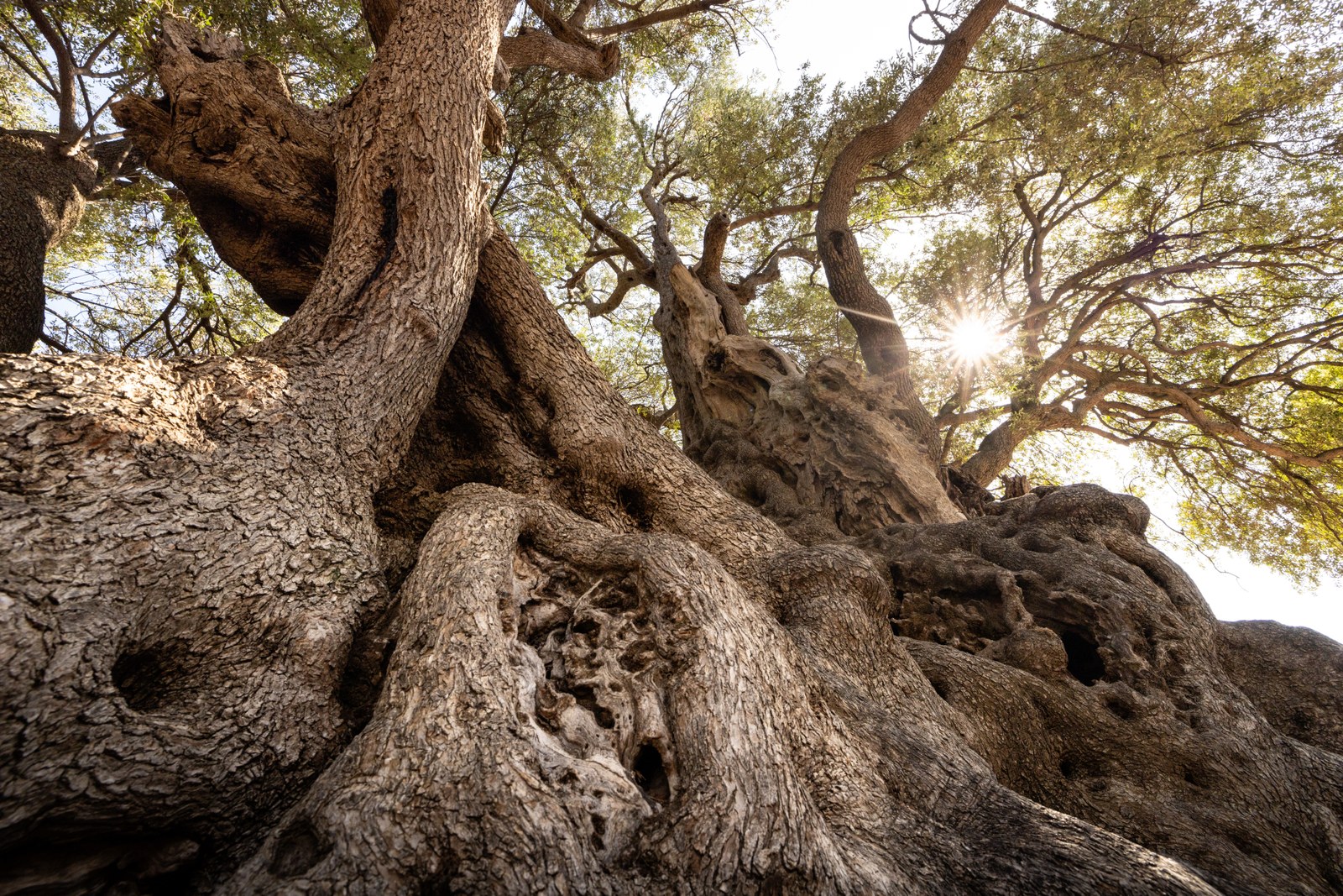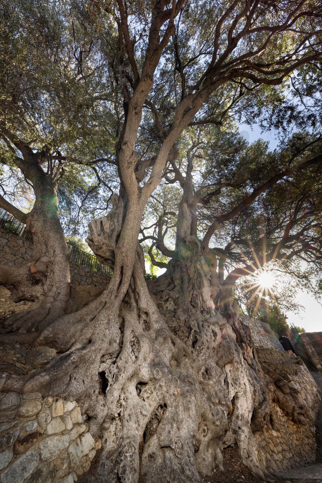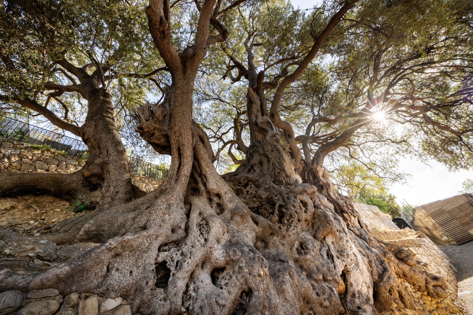 Cet olivier a poussé dans les fondations d’un ancien mur, qu’il a enlacé de très nombreuses racines. Il n’est pas composé d’un tronc unique, mais de nombreux rejets de grande taille. L’ensemble atteint