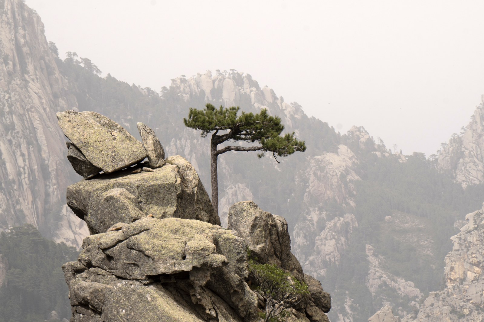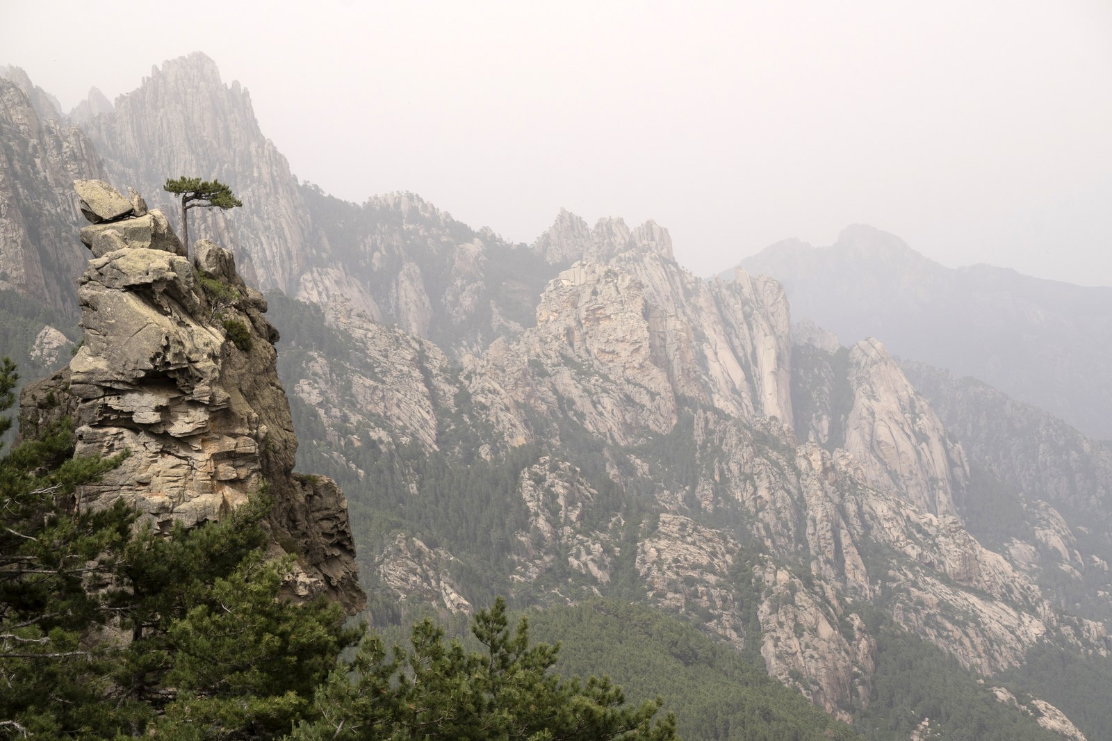 Avec ses 4 mètres de hauteur et son mètre à peine de circonférence, ce pin laricio se démarque pas par ses dimensions, mais bien davantage par son emplacement très particulier dans un environnement extrême. Équilibriste et solitaire, il s’est accroché au sommet de l’aiguille granitique Pilastru di l’Alba, au cœur du massif de Bavella, en Corse. On imagine aisément la rigueur des conditions qui font son quotidien : son port accidenté témoigne des fortes rafales qui balayent régulièrement les lieux. Ses conditions