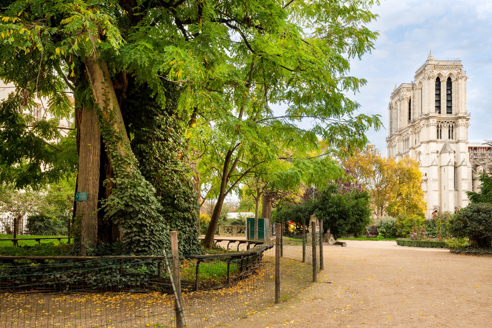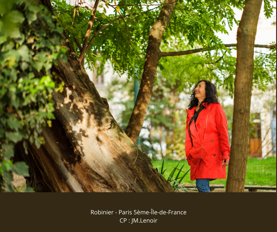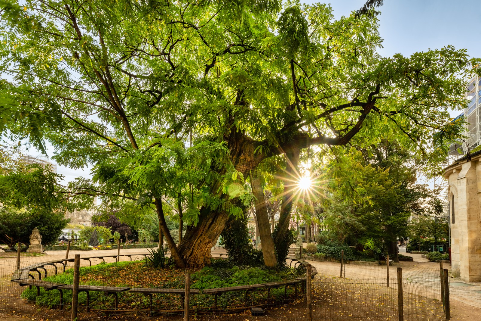 L’histoire raconte que l’on doit à Jean Robin (1550-1629), arboriste des rois Henri III, Henri IV et Louis XIII et directeur du jardin des Apothicaires, la première plantation de robiniers faux acacia en Europe, au tout début du XVIIe siècle, à partir de graines reçues de son ami John Tradescant the Elder, un naturaliste, jardinier et voyageur britannique, qui introduisit de nombreuses plantes en Grande-Bretagne. Parmi elles figure cet individu, situé dans le square René-Viviani, au cœur de Paris, et jouxtant l’église de Saint-Julien-le-Pauvre, qui aurait été planté en 1601 ou 1602, on ne sait pas très bien. Il est réputé être aujourd’hui le plus vieil arbre de la capitale et le plus ancien des robiniers européens. C’est un arbre patrimonial, qui fait partie des points de visite de la ville, tout près de la cathédrale Notre-Dame. Avec le temps et du fait d’évènements violents, d’incendies et de guerres, l’arbre originel âgé de plus de 400 ans est un sujet penché, anciennement brûlé. Voué à dépérir par une chute fatale, il a été sauvé grâce aux habitants, qui lui ont apposé une poutre de rétention (un étai) contre le tronc, il y a plus de cent ans. Aujourd’hui, ce grand vieillard appuyé sur sa canne fleurit tous les printemps, mais traverse les années sur un rythme de croissance très ralenti, à la manière des bonsaïs. Il cesse d’étendre ses branches, raccourcit ses pousses, mais émet depuis ses racines de nouveaux individus (que l’on appelle des drageons en botanique). Y aurait-il ici comme un parfum d’éternité ?
