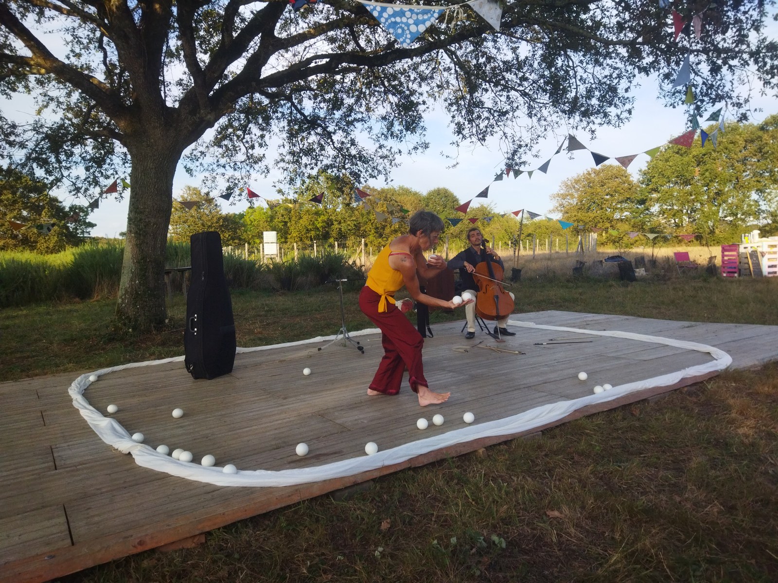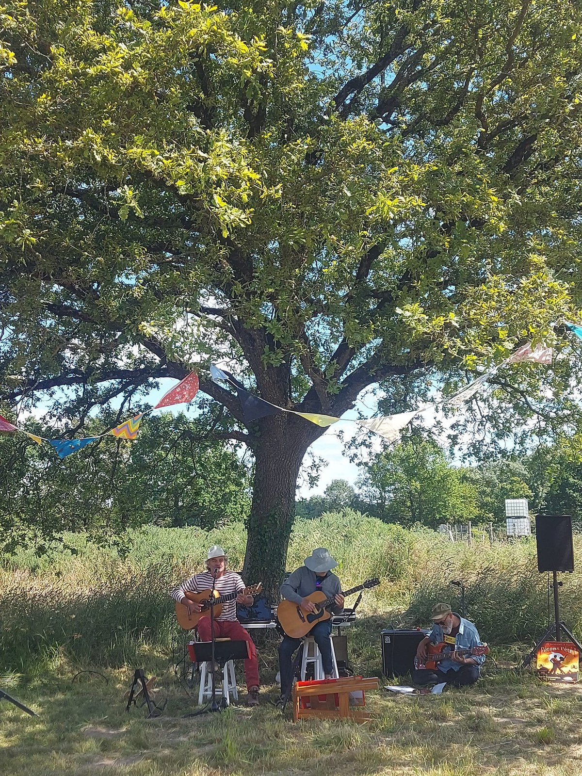 Le Chêne des Rautardières Je suis le Chêne des Rautardières. Majestueux et isolé au milieu de 2,3 ha, je me situe à la limite de deux anciennes parcelles agricoles, fauchées inlassablement par le paysan à qui cette mission a été confiée durant une dizaine d'année. Jadis, je devais faire partie d'une haie séparant deux champs, mais ce que les Hommes ont appelé "le grand remembrement" n'a malheureusement pas épargné mes plus jeunes voisins. Un beau jour de 2021, mon propriétaire, Pierre, a rencontré une chouette association dénommée "les GarnemAnts", voilà qui s'annonçait prometteur ! Ce collectif éco-citoyen s'était mis en tête de redonner à la biodiversité ses lettres de noblesse, et c'est bien là ce qui a conquis Pierre. Il leur a donc permis d'investir mon royaume d'herbes folles pour m'apporter une compagnie un peu plus ligneuse. Les bipèdes se sont mis à planter autour de moi des arbres fruitiers et bocagers, un jardin médicinal, à creuser une mare et un puits, et surtout à m'offrir le plus bel écrin qui m'est dû : un théâtre de verdure face auquel je trône royalement. Lorsqu'ils m'ont rencontré, ces GarnemAnts m'ont en effet immédiatement considéré comme LE grand esprit des Rautardières. Et il me fallait évidemment une place centrale dans ce lieu où devait se mêler la Nature et l'Humain. Ils ont donc eu cette fabuleuse idée de me mettre sur scène. Ou en scène ? Probablement les deux ! Ma ramure parfaitement équilibrée apporte ainsi une ombre bienfaitrice aux artistes qui jouent à mes pieds, mais aussi sur les convives qui s'abritent sous ma ramure lors des piques-niques estivaux. Je suis tellement précieux aux yeux de mes nouveaux gardiens, qu'en 2024, ils ont apposé leur paraphe sur un document* me protégeant pour les 99 prochaines années ! Quatre année se sont écoulées depuis leur rencontre, et je vois les jeunes arbres plantés hisser doucement leur cime vers le ciel. Ils ne sont pas prêts de rattraper mes royales mensurations, mais il est vrai que j'ai une cinquantaine d'années d'avance !