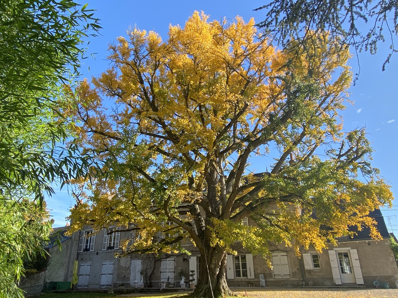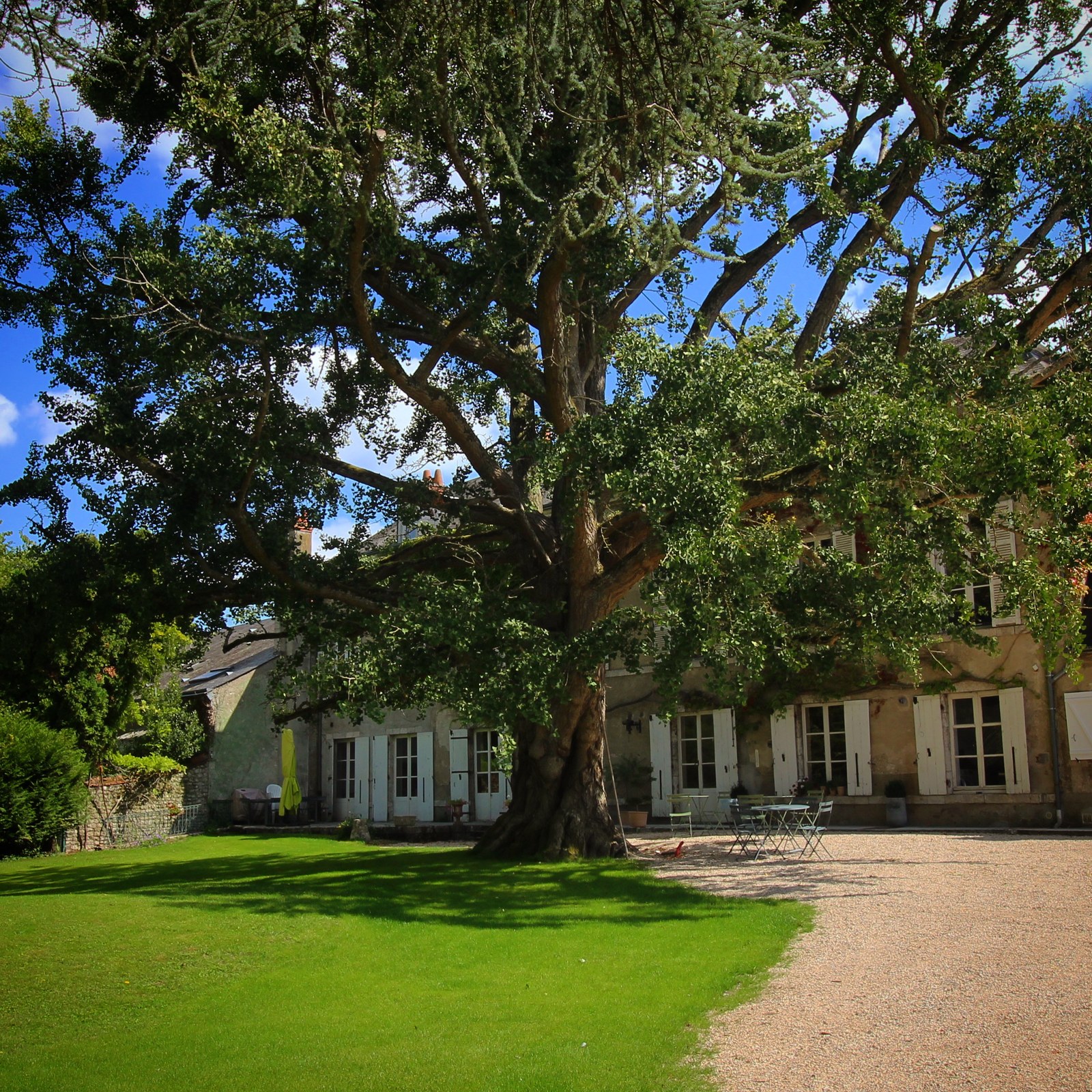 Nous sommes arrivés dans cette maison en 2019, totalement tombés sous le charme de cet arbre qui fait toute la beauté du parc. Car le Ginkgo Biloba du parc du Domaine Saint-Hilaire est sans aucun doute l’un des plus beaux spécimens de la région Centre Val de Loire.Très certainement planté à la construction de la maison, nous estimons son âge à environ 170 ans. Maison qui fût construite par une grande famille de tanneurs magdunois : Les Landrons. Il confère au parc du Domaine une ambiance apaisante. Le petit-déjeuner à l'ombre de ses feuilles est quant à lui particulièrement agréable.